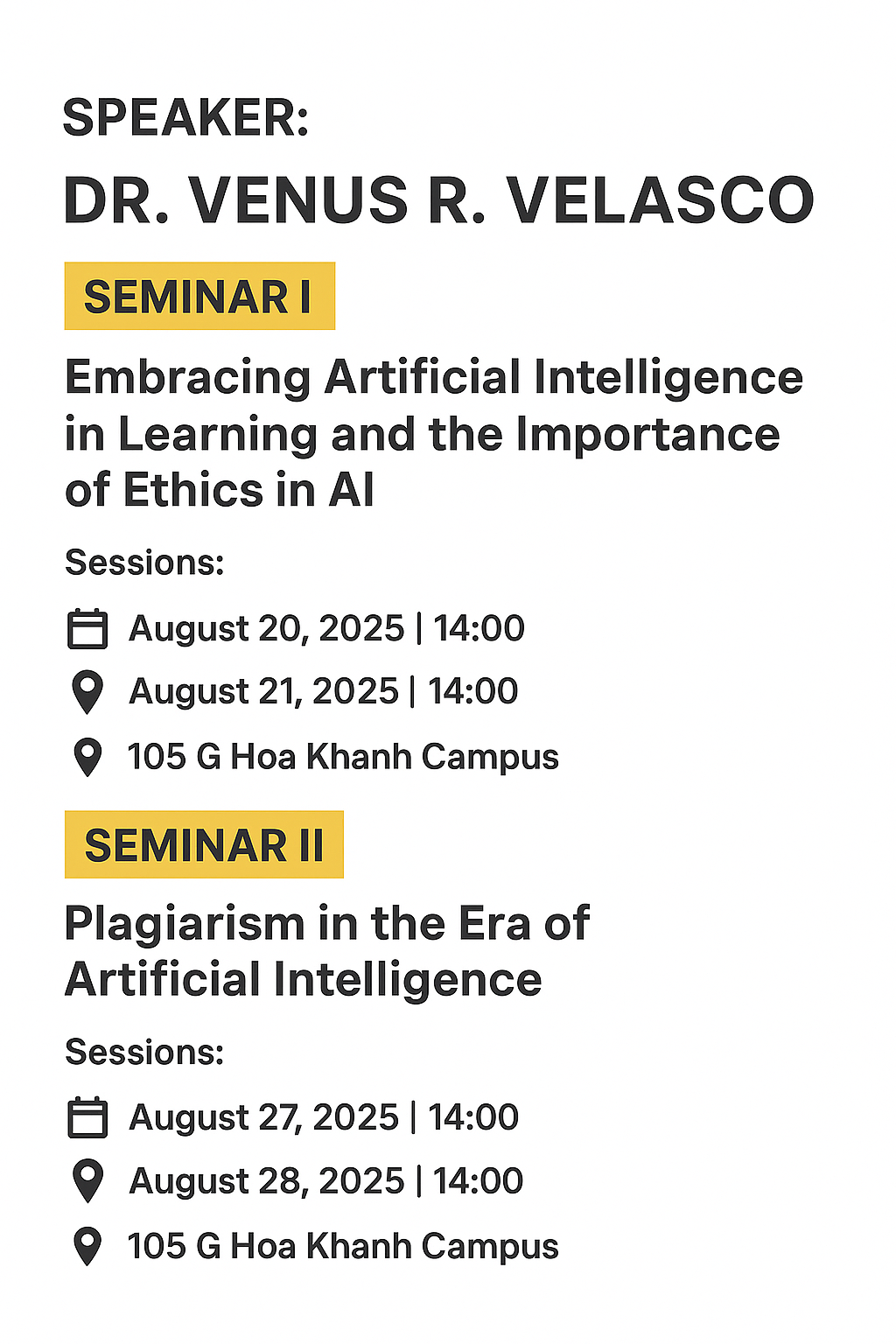 SouthStar Management Institute is pleased to invite students to a series of insightful seminars led by Dr. Venus R. Velasco, focusing on the role of Artificial Intelligence (AI) in higher education and the importance of academic integrity in the AI era.